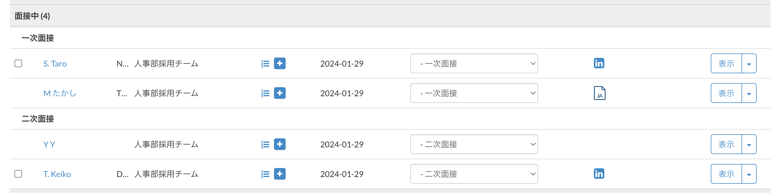 <メインステータス「面接中」のサブステータス「一次面接」に2名、「二次面接」に2名入っている状態>