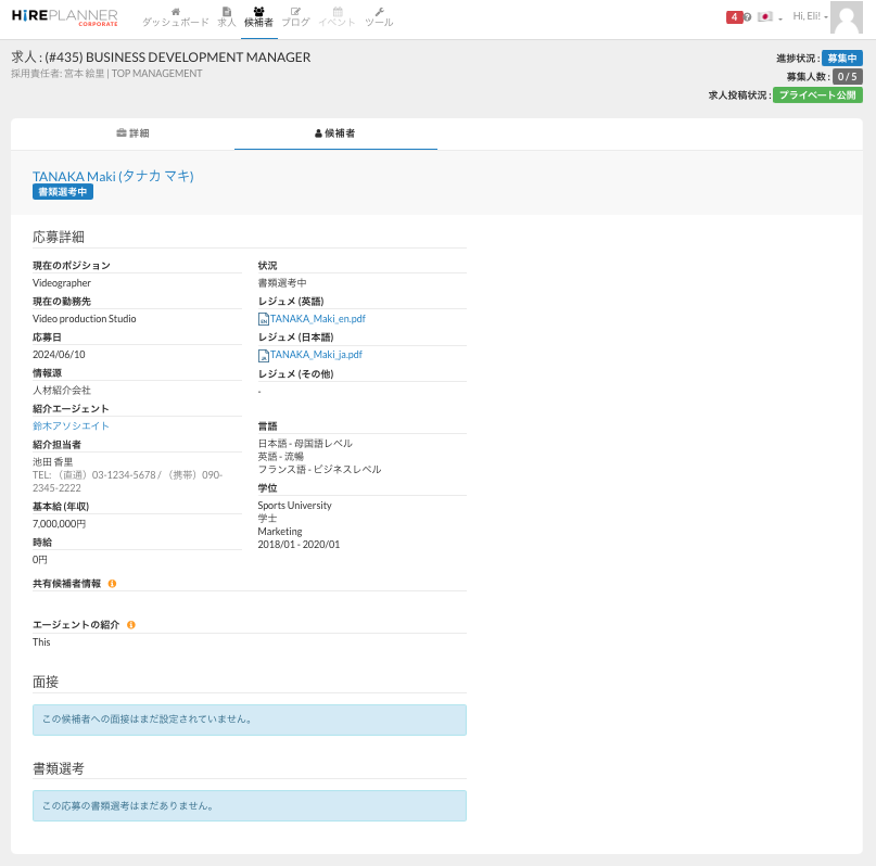 各候補者が応募してきた時の応募情報や面接結果などを見ることができます。応募詳細ページの開き方は、マニュアルの「応募詳細ページの開き方」を参照してください。