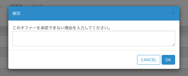 「オファー拒否」のボタンをクリックすると、承認できなかった理由を入力する画面が表示されます。理由を入力して「OK」ボタンをクリックしてください。採用担当者の画面に承認できなかった理由が表示されます。