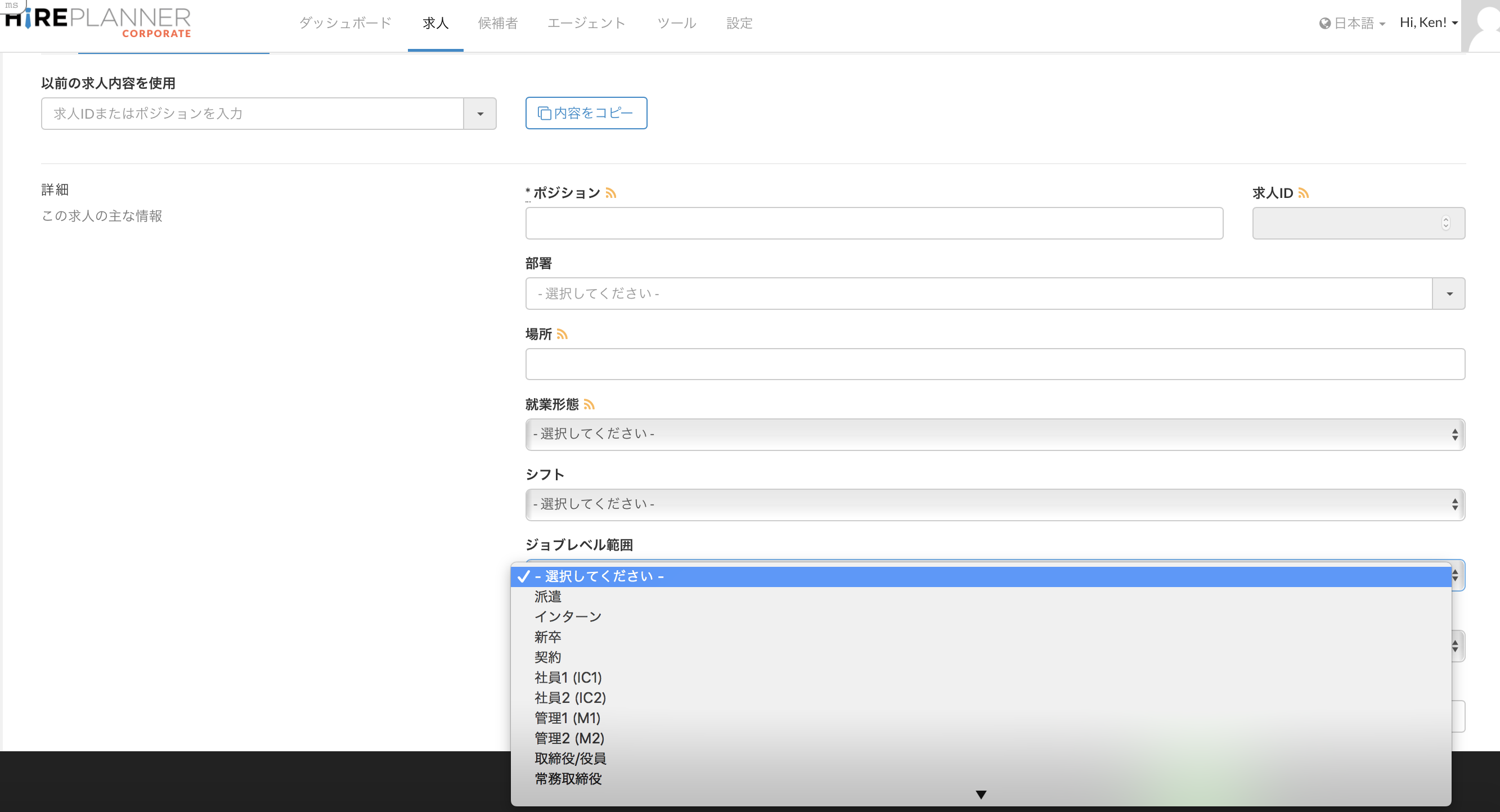 <参考>求人票を作成する際にジョブレベルリストの順にドロップダウンで表示されます。