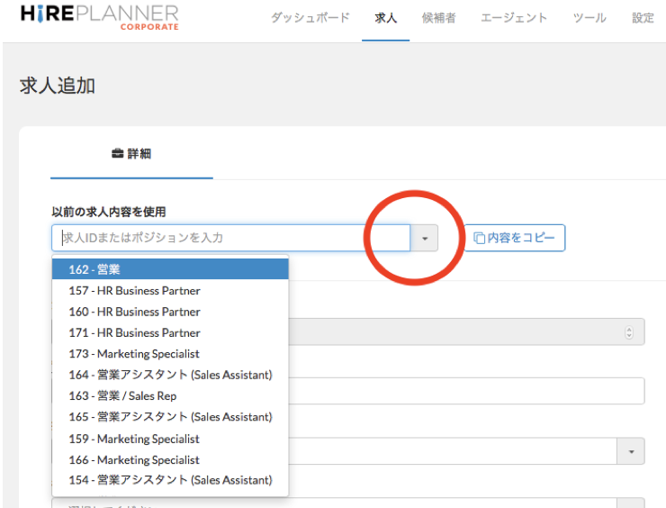 または左側の三角をクリックすると、以前に作成した求人のリストが表示されますので、コピーしたい求人を選択してください。