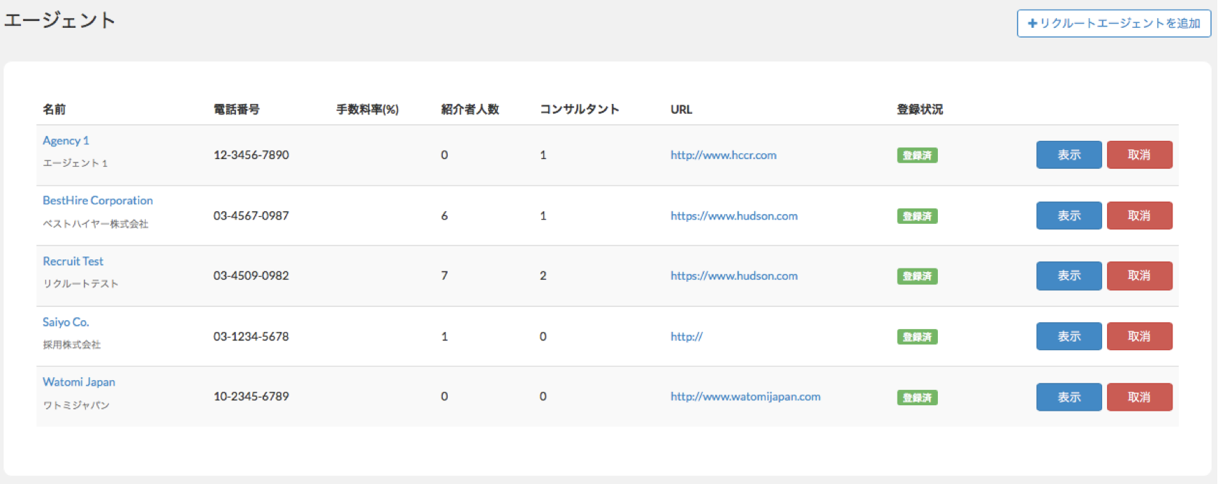 HirePlaner上で管理している人材紹介会社の一覧を閲覧することができます。