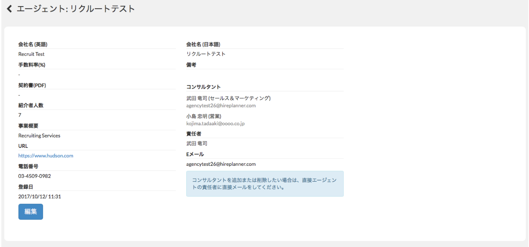 - 責任者:HirePlannerにおいてエージェント会社の情報(会社情報やコンサルタント情報など)を管理する人です。コンサルタントの増減などは、この責任者が行うこととなっていますので、直接連絡をしてください。
