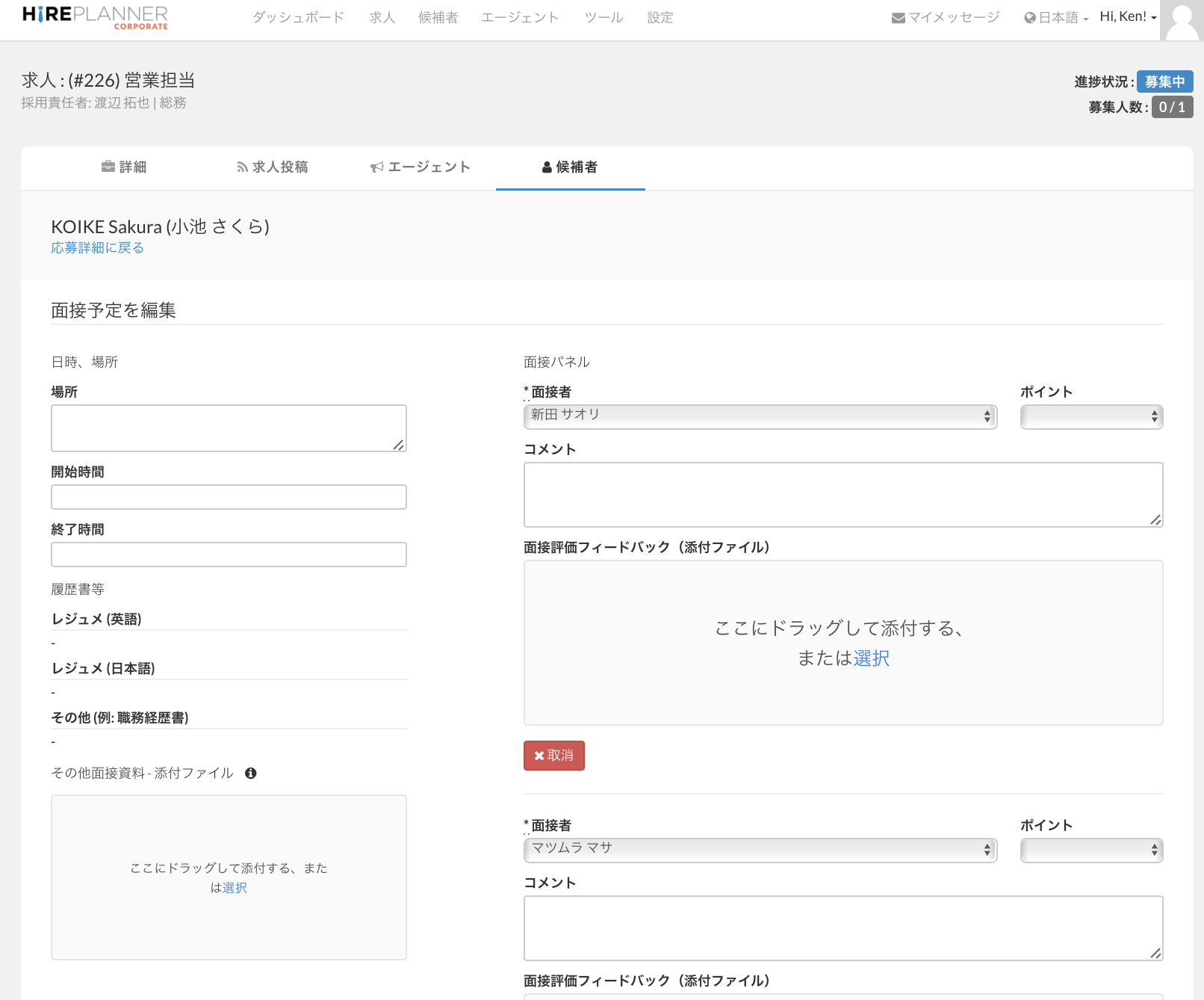 人事採用担当者は、面接者でなくても面接のフィードバックのコメント等を入力することができます。