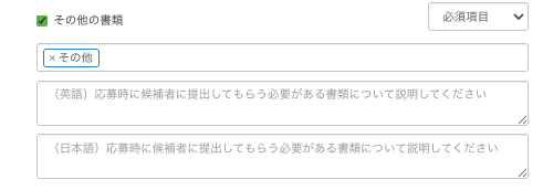 「その他書類」が「必須項目」となっている場合には、いずれか一つでも書類が添付されていないと応募できないようになります。提出してもらいたい書類がすべて必須ではない場合には、「オプション」を選択してください。
