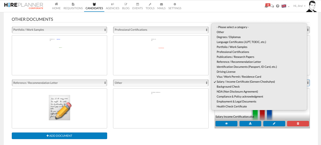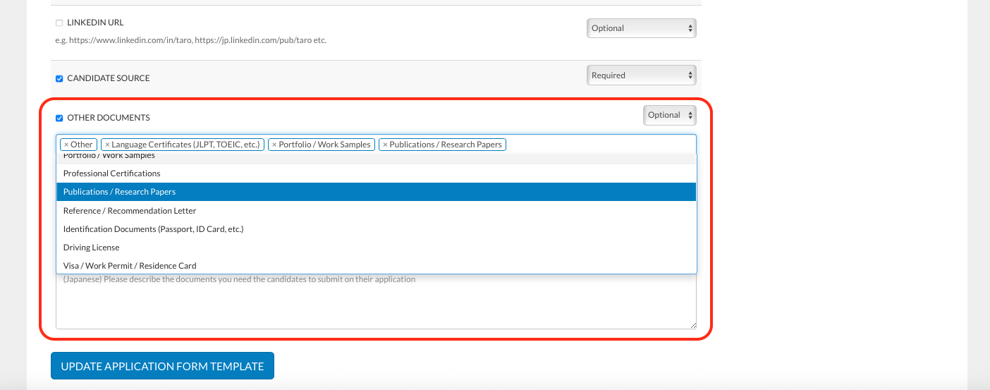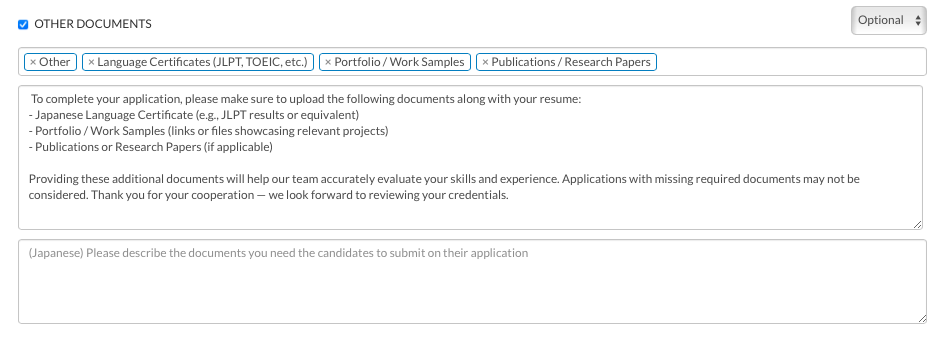 Simply select the specific document categories you require and add detailed instructions in English and/or Japanese to guide the candidates.