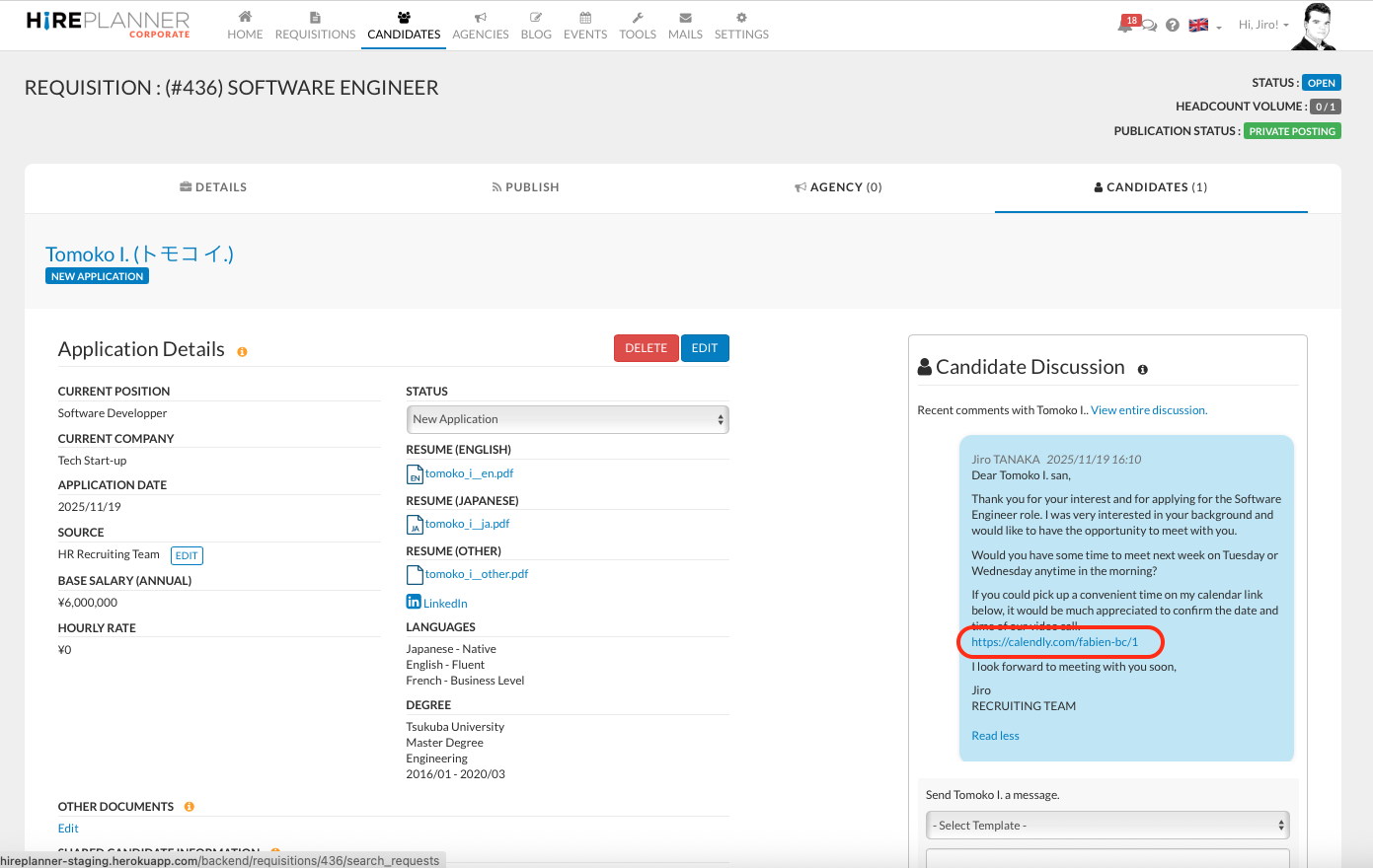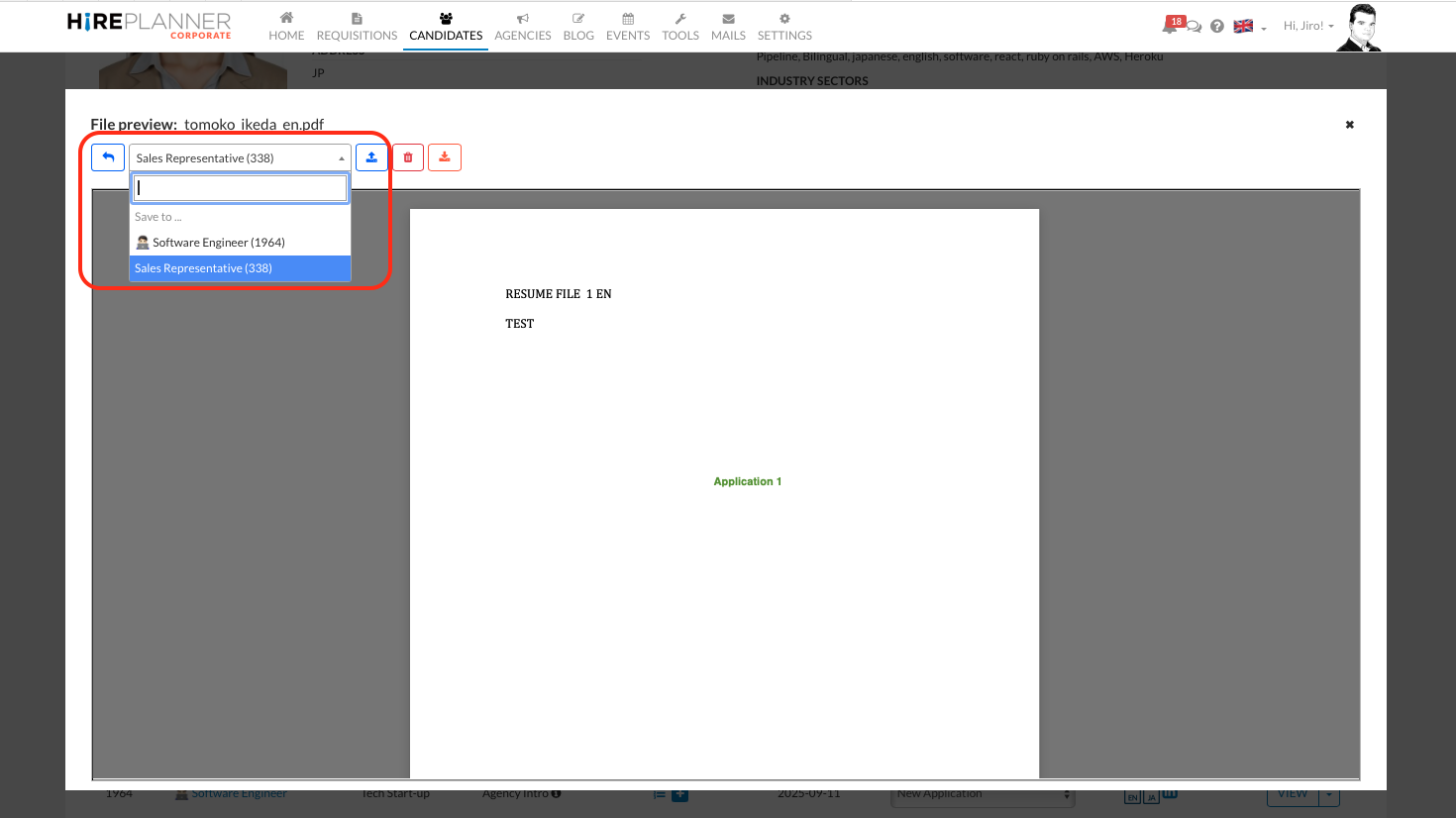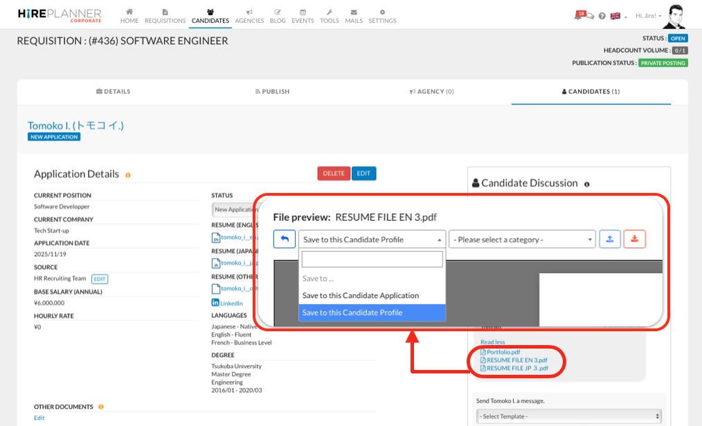 From the Messenger area on the candidate’s application page, you can now easily save attachments and documents directly to either the candidate profile or the specific application.