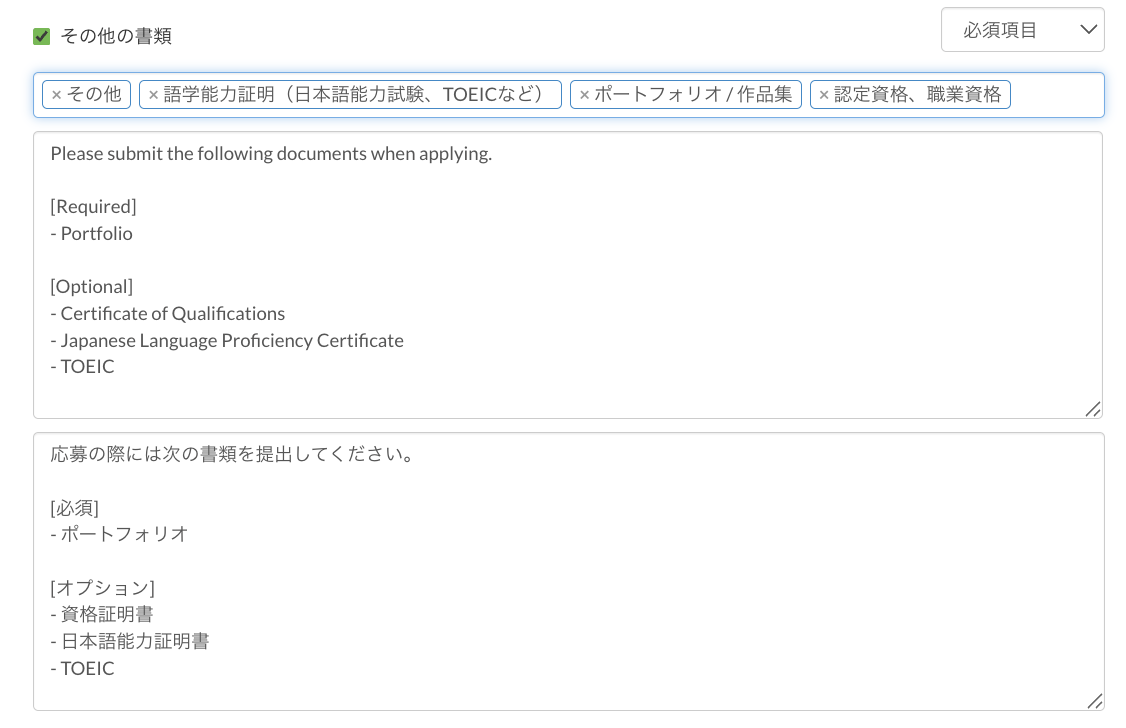 提出してもらいたい書類のカテゴリーを選択し、求職者向けのガイダンスを英語と日本語で追加します。