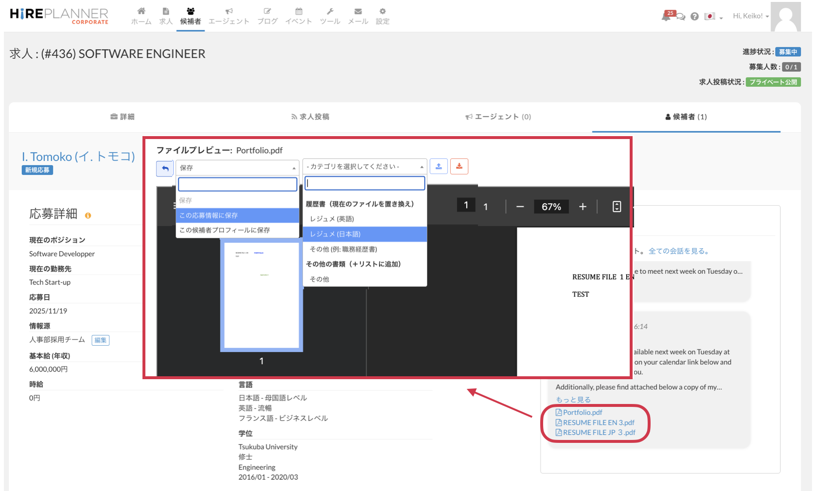 候補者の応募ページにあるメッセンジャーエリアから、受信した添付ファイルや書類をその候補者のプロフィール、もしくはその応募情報ページに簡単に保存できるようになりました。