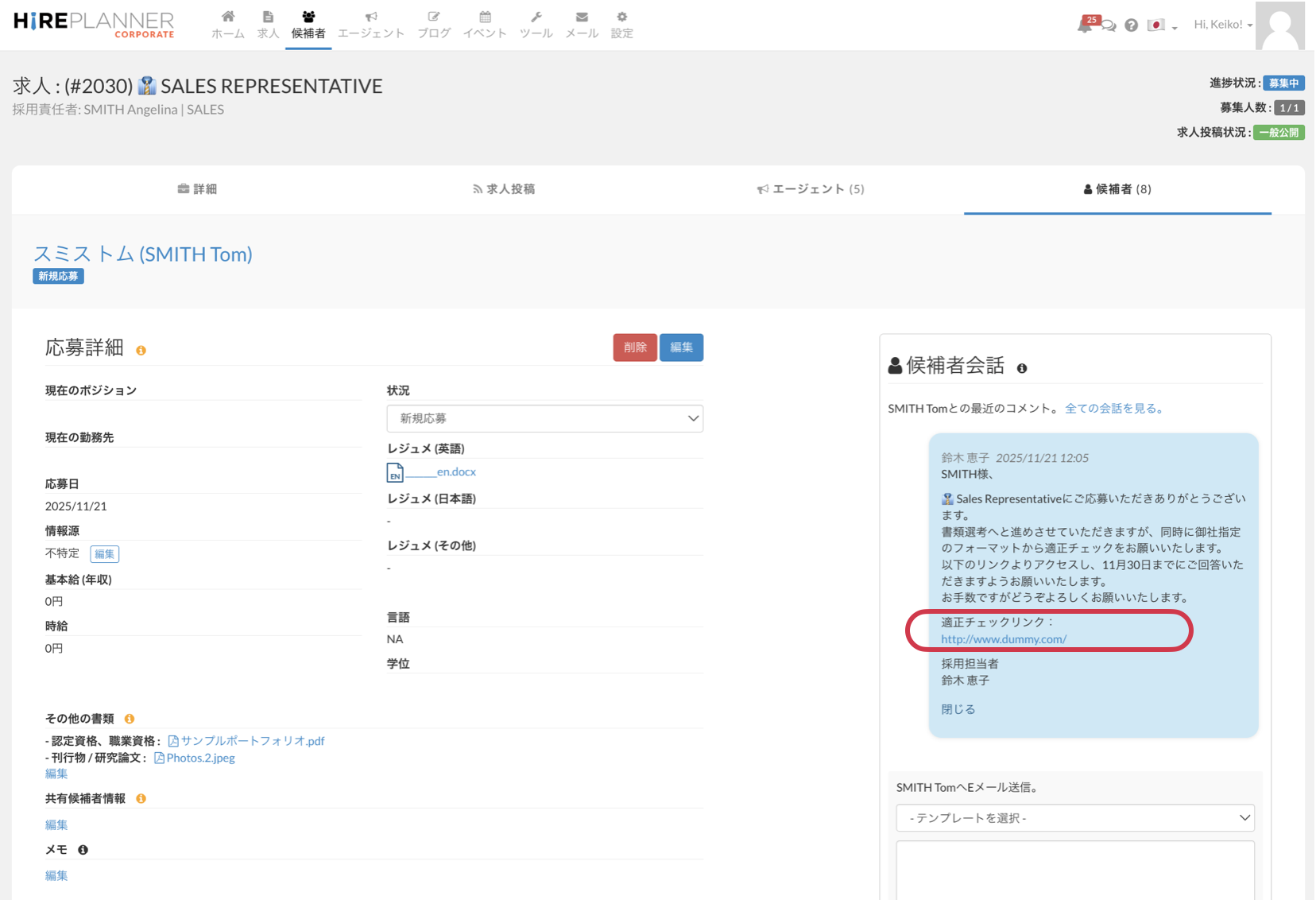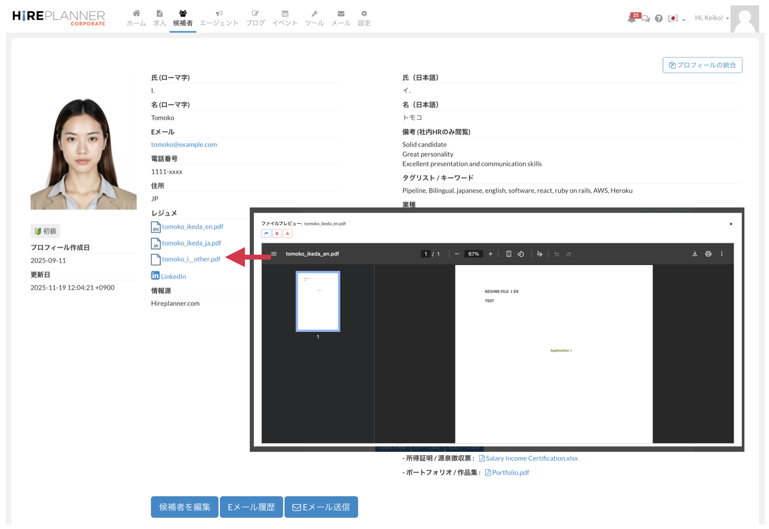 3. 候補者プロフィールと応募情報の両方のページにその他書類を追加保存可能