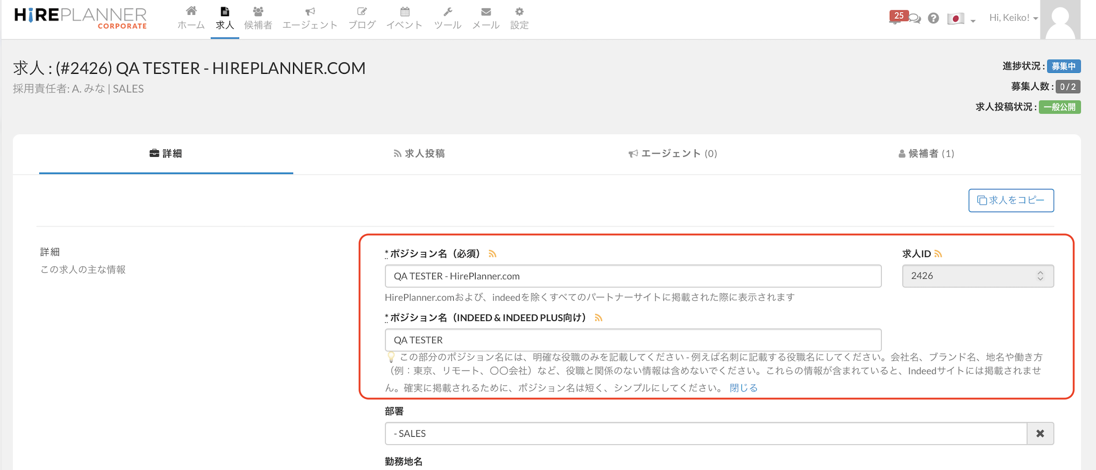 また、今回のアップグレード前に作成された求人情報は、既存の「ポジション名」がそのままIndeed向けのフィールドにコピーされています。必要に応じて、Indeed向けの「ポジション名」の修正を行ってください。
