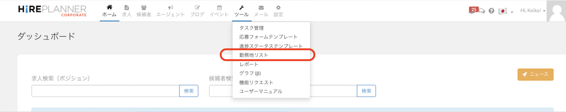 求人情報にある「勤務地名」の部分をクリックすると、作成された勤務地のリストが表示されますので、ドロップダウンの名から適切なものを選択してください。キーワードを入力して検索することも可能です。