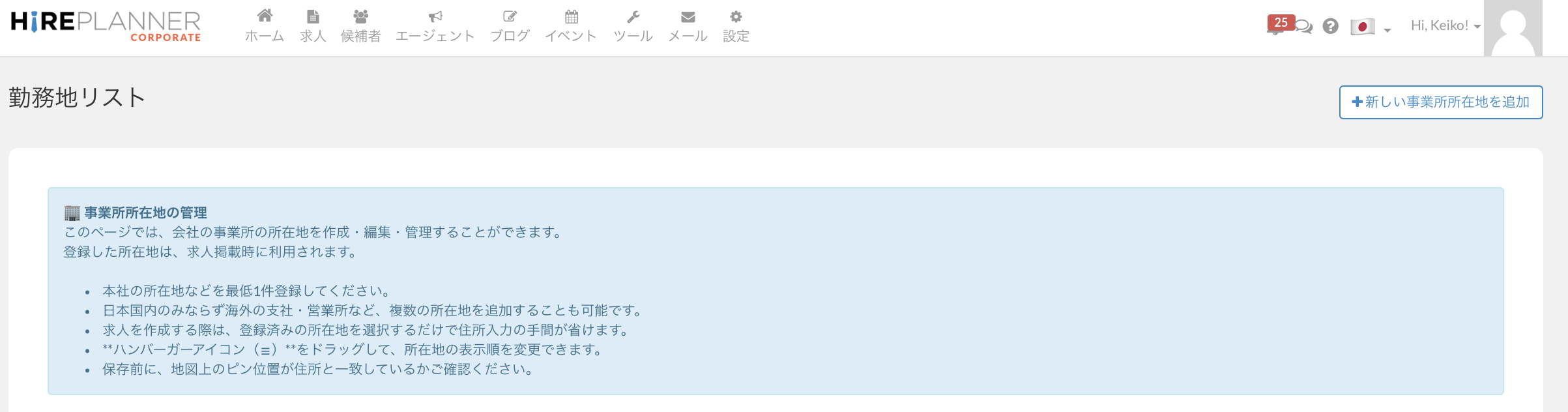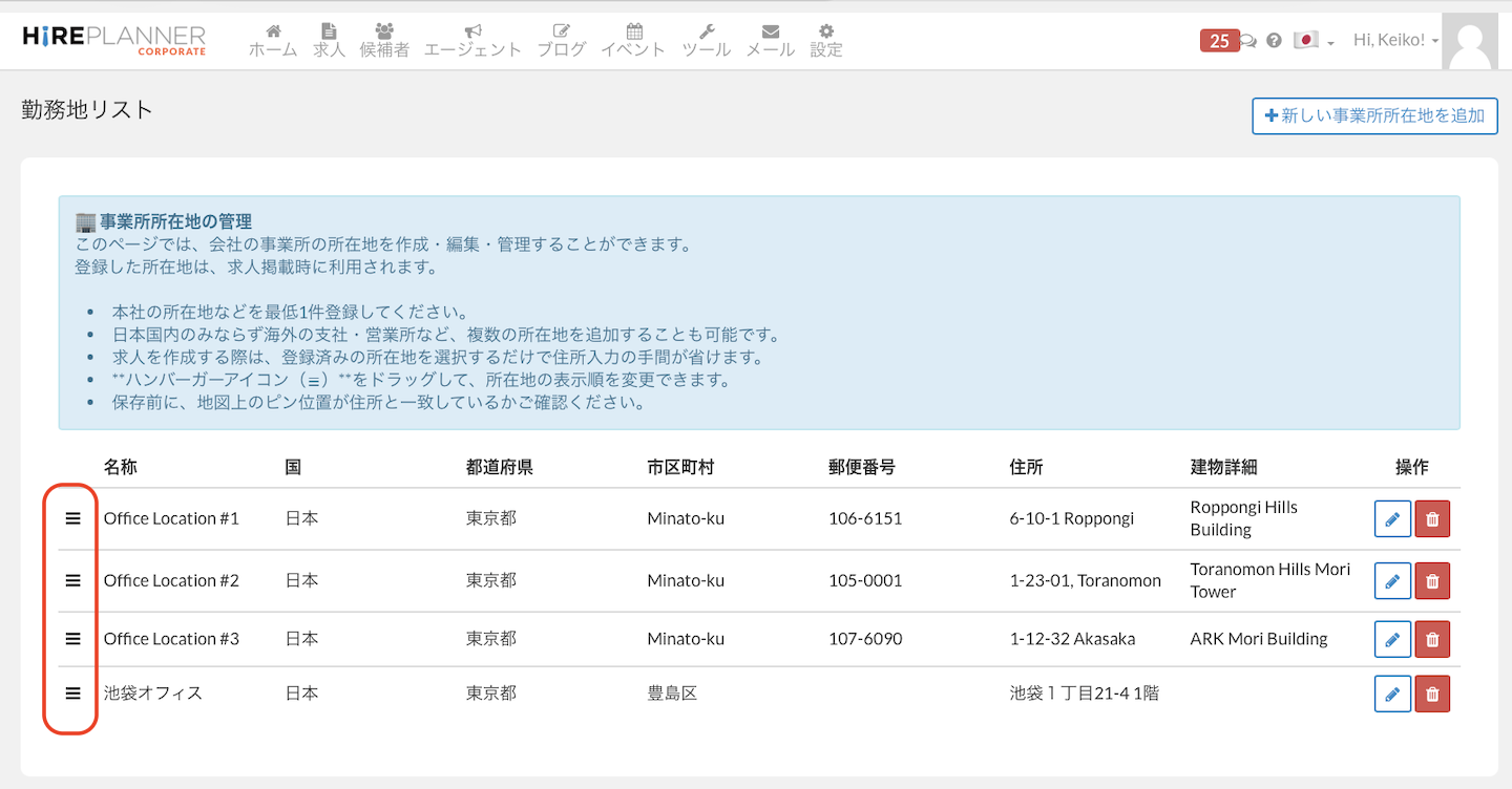 この新機能は、人事採用担当者の皆さまが、オフィス、店舗、事業所など勤務地を HirePlanner 内の1つのセクションから一元管理できる ように設計されています。
