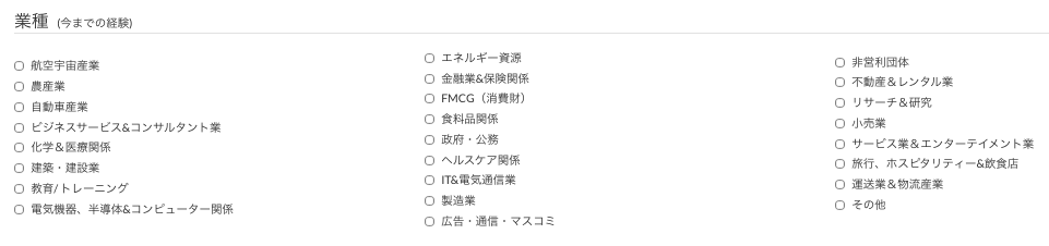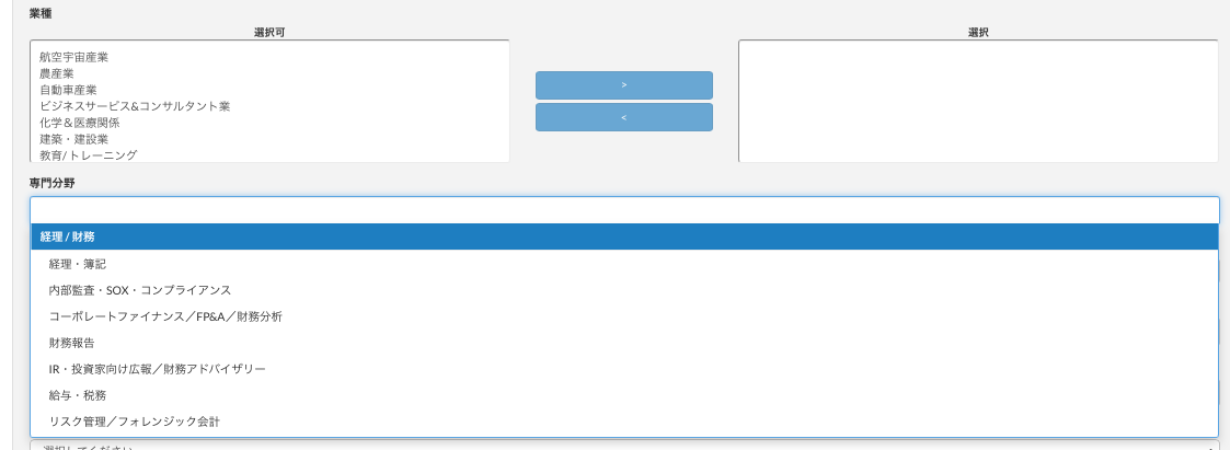 候補者のプロフィールには、その候補者のこれまでの経歴に関連のある「業種」と「専門分野」を登録する部分があります。