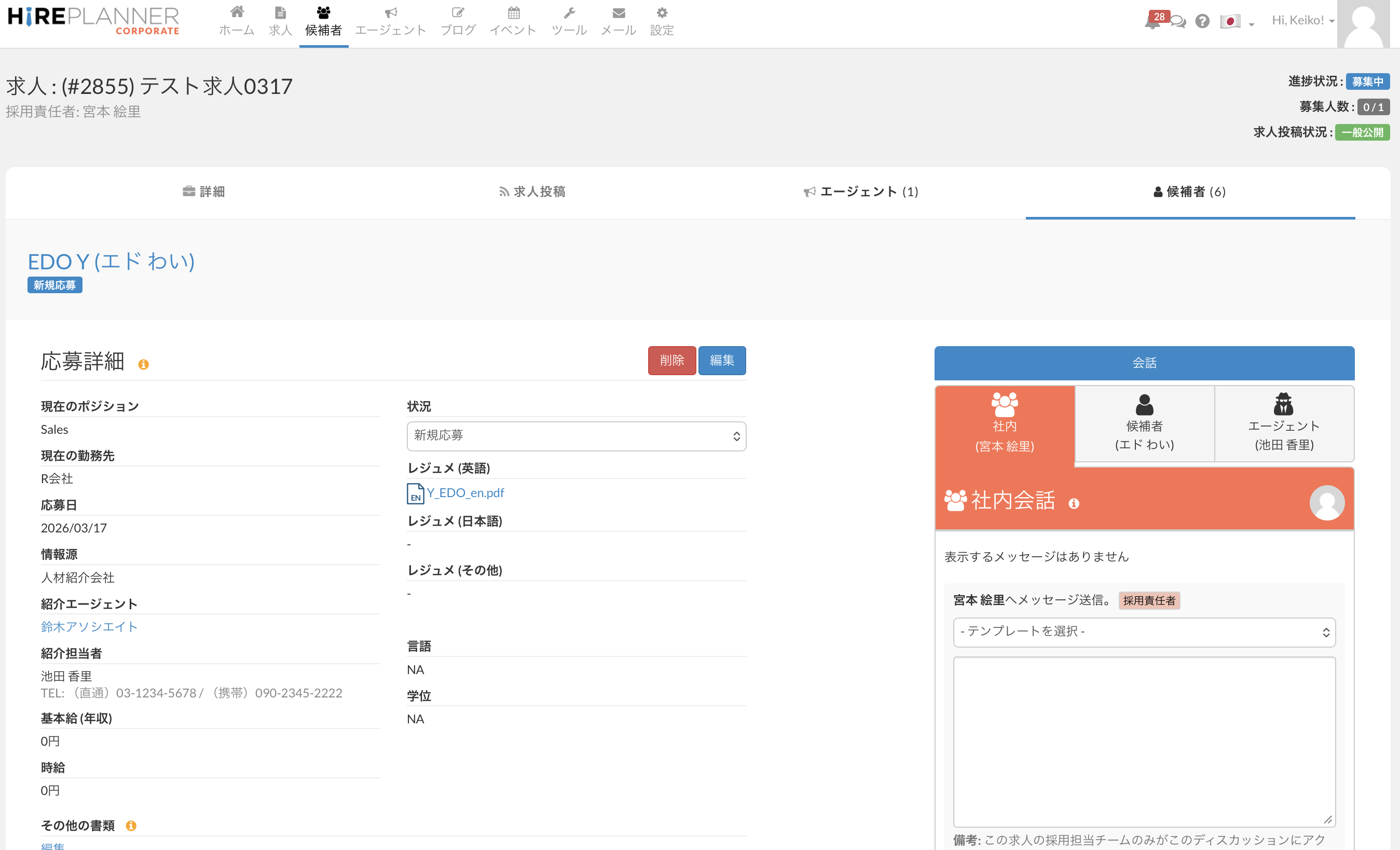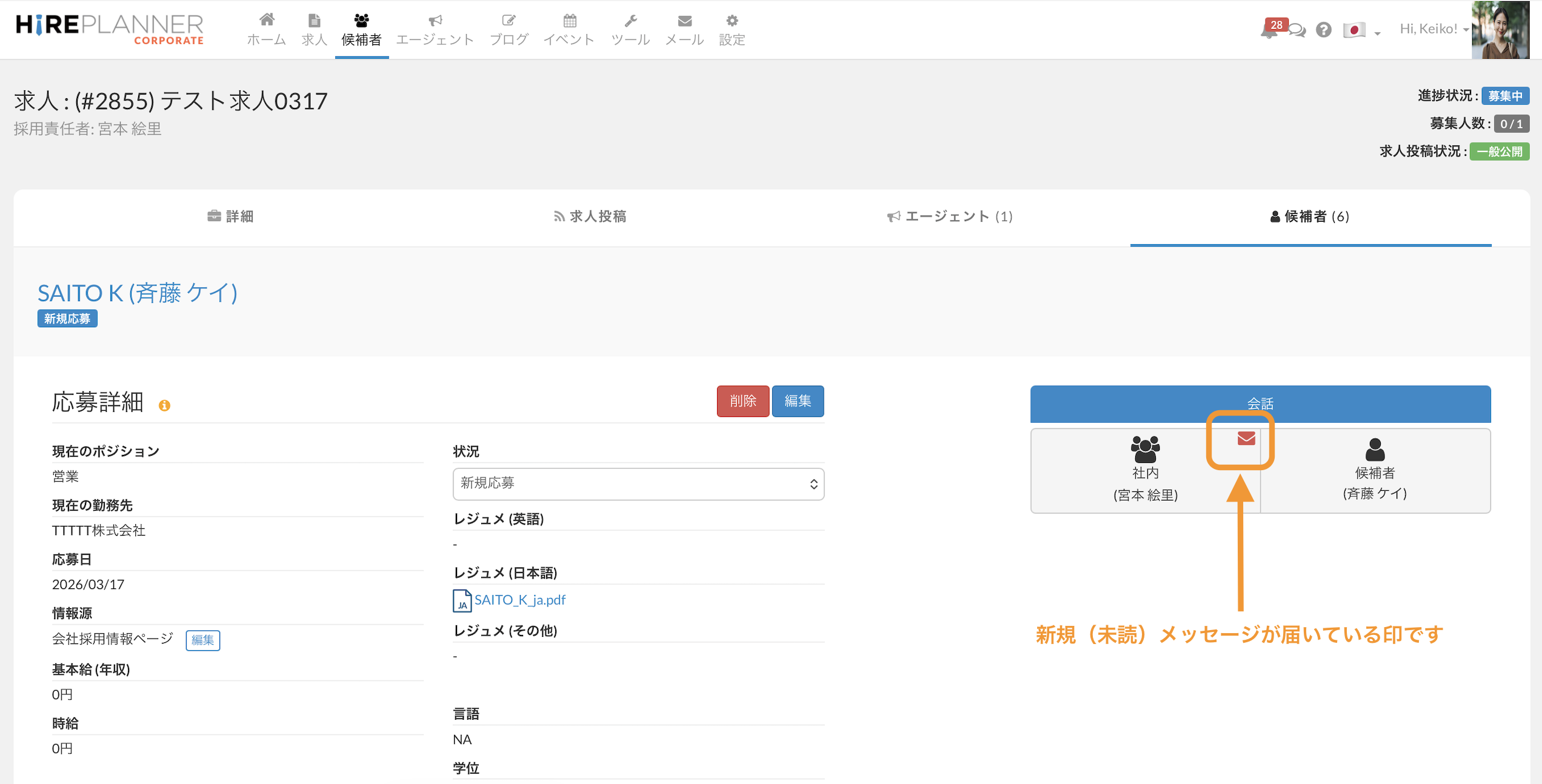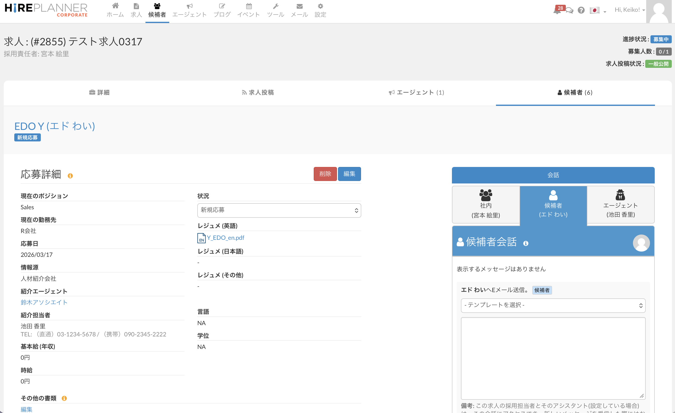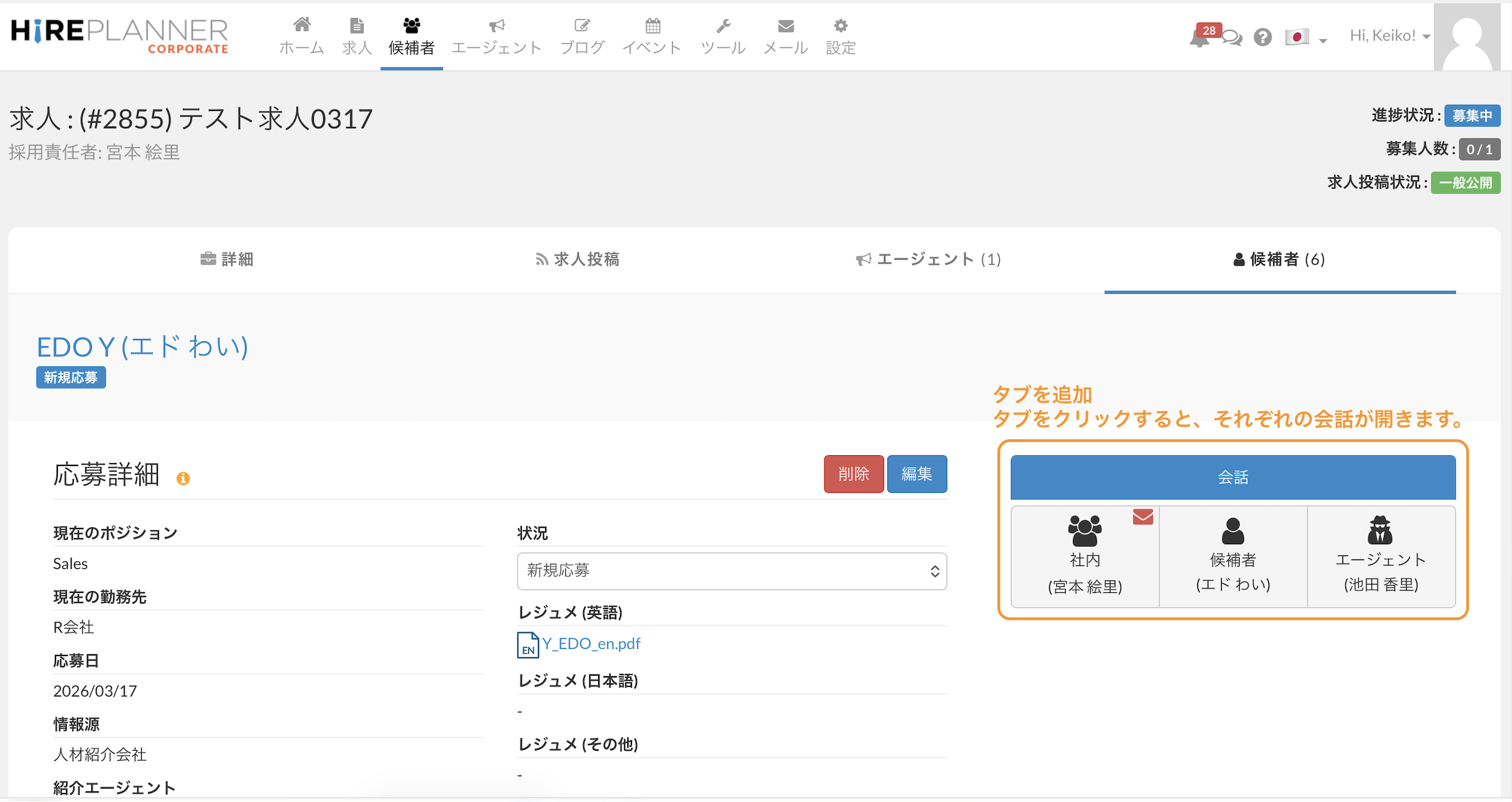 2. 候補者の応募ページ:候補者との会話