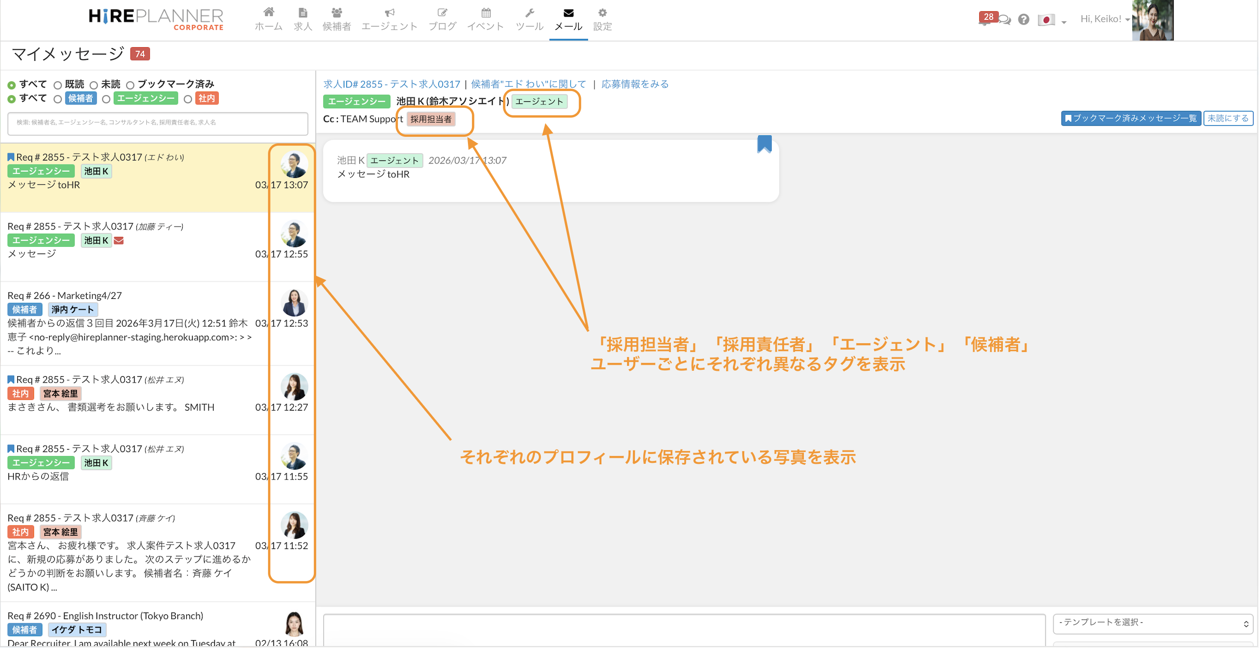 誰と会話しているのかを一目で把握できるように、採用担当者、エージェント、候補者、採用責任者の4つのユーザータグを表示しました。また、プロフィール写真も表示されるため、混乱することなくスムーズに会話を確認・管理できます。
