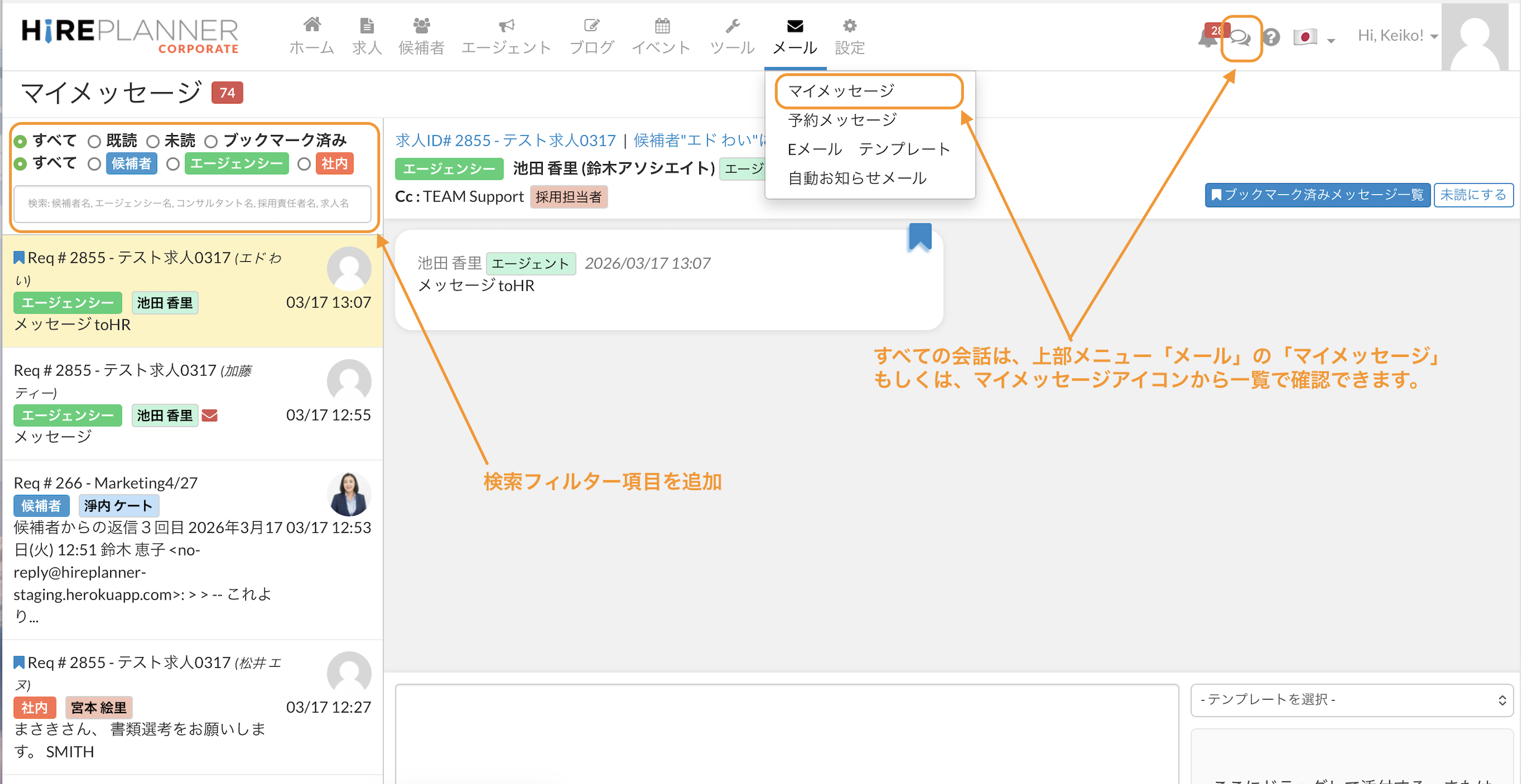 新しいHirePlannerメッセンジャーは、採用担当者、チームマネージャー、エージェント、そして候補者を、ひとつの統合されたコミュニケーションハブに集約します。社内採用担当者は、チームマネージャー(採用責任者)やビジネスパートナーとシームレスに連携しながら、エージェントや候補者とのやり取りも、すべてHirePlanner上で完結できるようになりました。