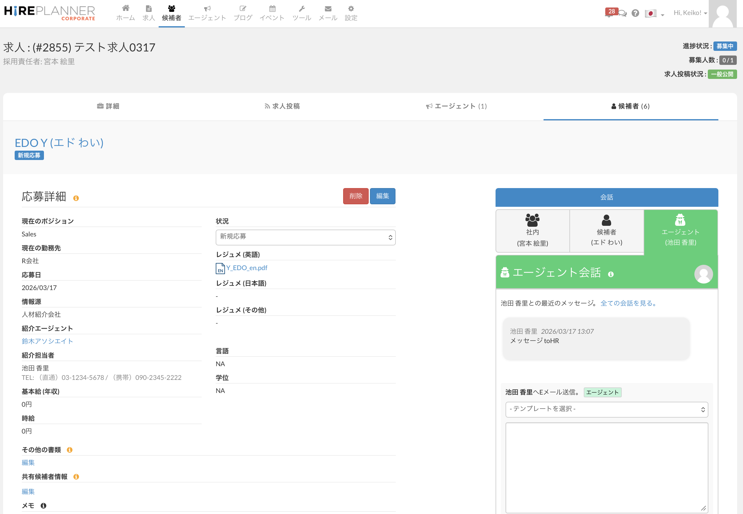 3. 候補者の応募ページ:エージェントとの会話