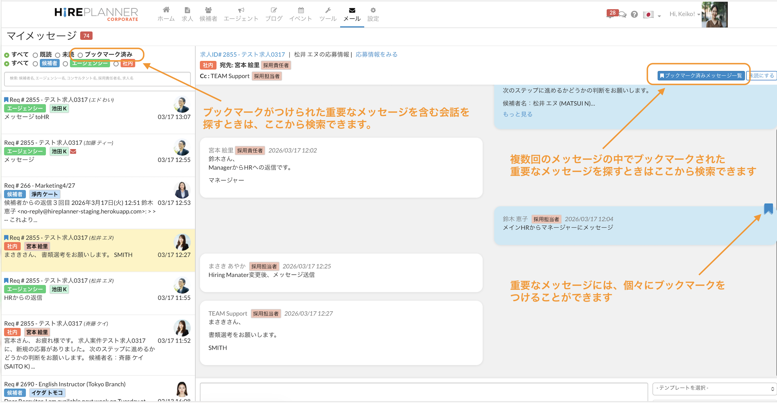 重要なメッセージや返信が必要なメッセージなどに対し、ピン留めをしておくことができます。このブックマークは、チーム内(求人を担当する採用担当者(アシスタントを含む)と社内会話の場合には、採用責任者と共有します。
