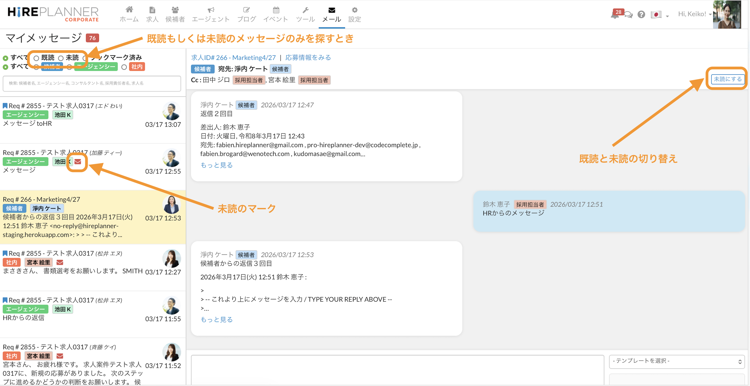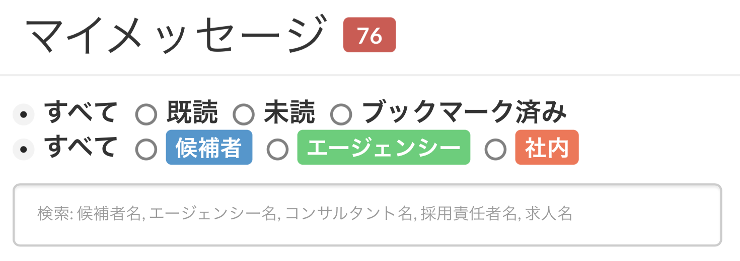 また、その上の「既読」や「未読」「候補者」「エージェンシー」などのタグ別のフィルターを合わせて活用できます。