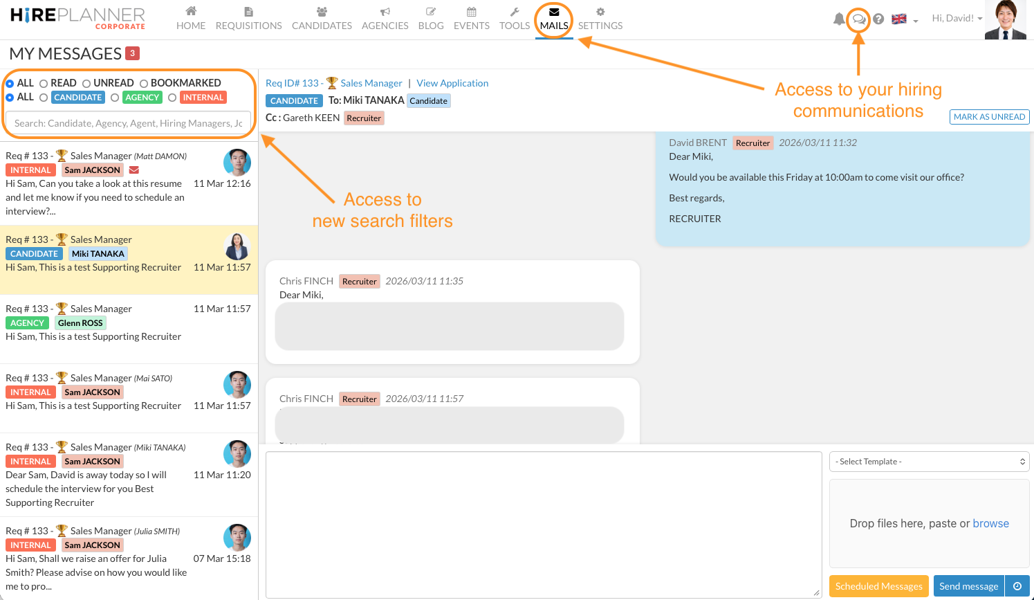 From "My Messages" section, you can view and access all your conversations with Hiring Managers, Agents and Candidates. If you want to focus only on discussions with your Hiring Managers or internal team members: