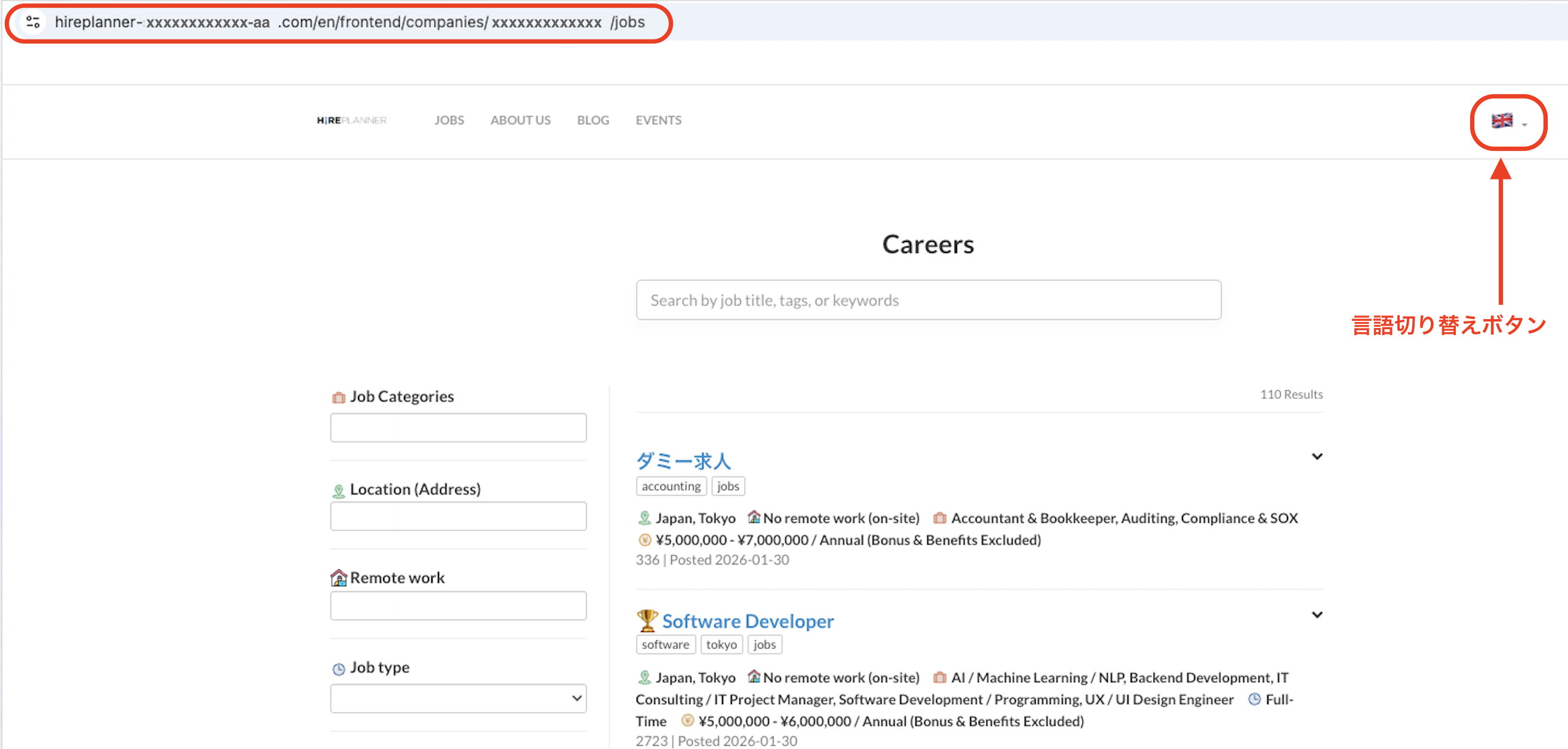 日本語自社サイトの「採用ページ」→ HirePlannerからの求人一覧ページは日本語表記